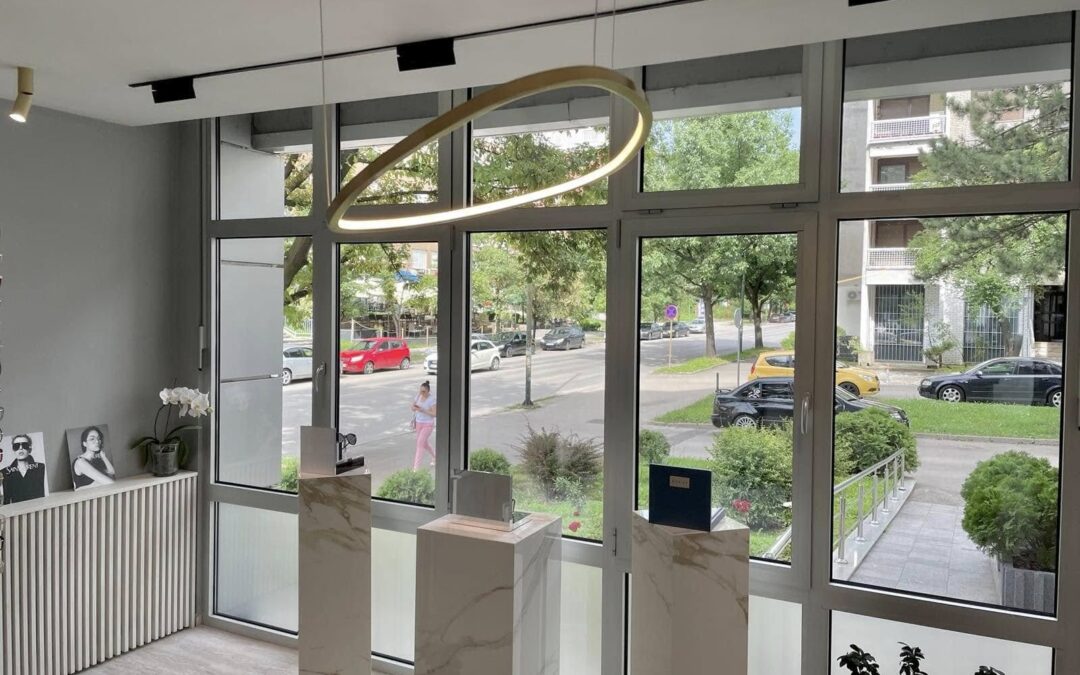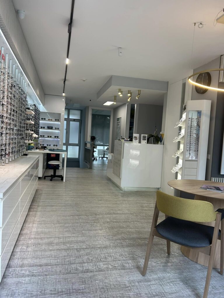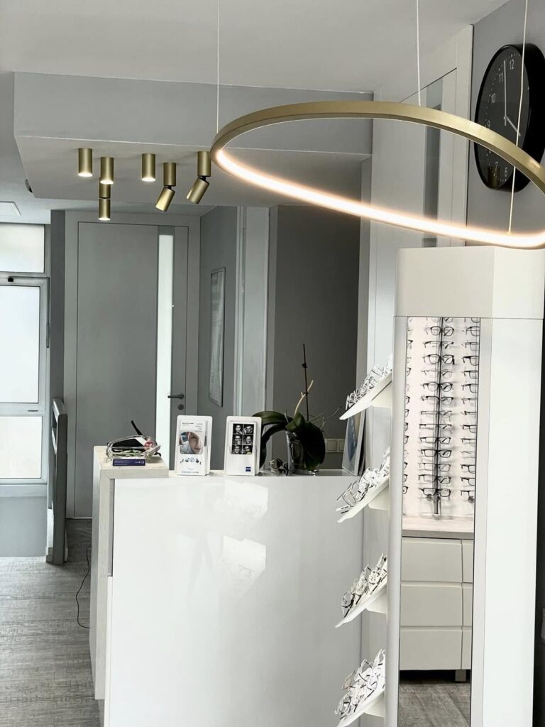 Optika Iris Tuzla. Maytoni slim magnetna rasvjeta i Maytoni luster, te maytoni spot rasvjeta nadgradna u mat zlatnoj boji iznad pulta.